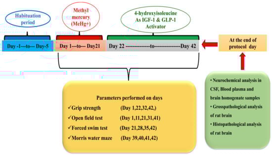 The total duration of the experimental protocol schedule was 42 days. From day 1 to 21, MeHg+ was regularly administered via oral gavage at the dose of 5 mg/kg. The test drug, 4-HI, was administered through an oral cannula at the dose of 50 mg/kg, and 100 mg/kg from day 22 until the 42nd day of the study duration. Animals were randomly assigned to six groups (n = 6 animals per group). Group 1: Normal control, Group 2: Vehicle control, Group 3: (4-HI100 mg/kg, perse, p.o.), Group 4: (MeHg5 mg/kg, p.o.), Group 5: (MeHg5 mg/kg, p.o. + 4-HI50 mg/kg, p.o.), and Group 6: (MeHg5 mg/kg, p.o. + 4-HI100 mg/kg, p.o.). The vehicle control group was employed in the study to determine whether the vehicle (water with 2% ethanol) alone causes any effects compared with untreated normal control. Various neurobehavioral assessments like grip strength test, open field test, forced swim test, and Morris water maze task were carried out between days 1 and 42 of the study duration to evaluate the alteration in behaviours like learning, memory, and emotion brain function in different experimental groups. At the end of the protocol schedule, i.e., day 43rd, animals were deeply anaesthetised with sodium pentobarbital (270 mg/mL, i.p.), and 2.5 mL of blood was collected from the rats through a retro-bulbar puncture [50], and 100 µL of CSF was collected from the cistern Magna and stored at −80 °C for future use. Animals were then sacrificed by decapitation, and their whole brains were carefully removed from the skull for various neurochemical estimations and gross morphological analysis. Fresh whole brains isolated from the rats were weighed and further homogenised in phosphate buffer saline (PBS). All the biochemical estimations were performed in brain homogenate, CSF, and blood plasma samples. Figure 1 shows a schematic representation of the protocol paradigm and time course of experimentation.