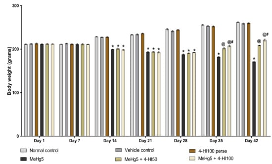 To determine the role of 4-HI in MeHg-treated rats, alterations in body weight were assessed on days 1, 7, 14, 21, 28, 35 and 42 of the experimental protocol schedule. On days 1and 7, there was no significant difference between the groups. On days 14, 21, 28, 35 and 42, a gradual decline in bodyweight was found in rats treated with MeHg compared to normal control, vehicle control, and 4-HI100 perse treated groups. Continuous oral administration of 4-HI50 mg/kg and 100 mg/kg significantly and dose-dependently improved the bodyweight when compared with MeHg-treated rats on the 14th, 21st, 28th, 35th and 42nd days of the experimental schedule (two-way ANOVA: F(30,180) = 187.8, p < 0.001). On days 35 and 42, 4-HI100 mg/kg treated rats showed significant improvements in body weight restoration compared to the 4-HI50 mg/kg treatment rats (Figure 2).