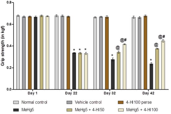 Grip strength tests were performed on days 1, 22, 32 and 42 of the protocol schedule to assess the potential influence of 4-HI on muscle strength. On day 1, a non-significant difference was observed between all the treatment groups. The oral treatment with MeHg for 21 days consecutively led to a gradual decrease in grip strength force on days 22, 32 and 42 compared to normal control, vehicle control, and 4-HI100 perse groups. Prolonged administration of 4-HI 50 mg/kg and 100 mg/kg showed a remarkable improvement in grip strength force on days 22, 32 and 42 when compared to MeHg-treated rats (two-way ANOVA: F(15,90) = 119.6, p < 0.001). Among these, 4-HI100 mg/kg was more effective than 4-HI 50 mg/kg in the restoration of grip strength on days 32 and 42 (Figure 4).