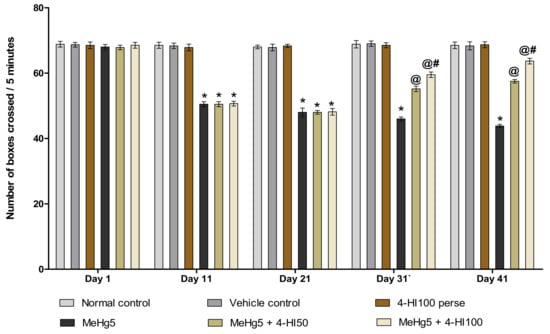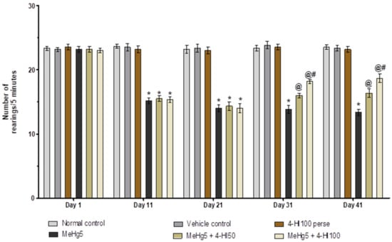 In order to evaluate general locomotor activity and examine the level of anxiety in rats, assessments of the number of boxes crossed and the number of rearings were performed on days 1, 11, 21, 31 and 41 of the protocol duration. On the first day, there was no significant difference between the groups. The MeHg-treated rats showed a progressive decline in the number of boxes crossed on days 11, 21, 31 and 41, and a considerable decrease in the number of rearings compared with normal control, vehicle control, and 4-HI100 perse groups. Consequently, the regular administration of 4-HI 50 mg/kg and 100 mg/kg significantly enhanced the locomotor activity (two-way ANOVA: F(20,120) = 35.71, p < 0.001) and restored the level of anxiety (rearing score)(two-way ANOVA: F(20,120) = 16.16, p < 0.001) as compared to MeHg-treated rats. On days 31 and 41, it was observed that 4-HI100 mg/kg considerably enhanced locomotion and improved the rearing scores when compared to the 4-HI 50 mg/kg treatment group (Figure 5 and Figure 6).
