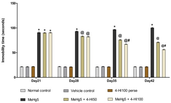 The forced swim test (FST) was performed on days 21, 28, 35 and 42 of the protocol sequence to explore the despair behaviour in rats. The MeHg-treated group showed depressive-like behaviour and a gradual increase in immobility time compared to normal control, vehicle control, and 4-HI100 perse treated rats. Long-term oral administration of 4-HI50 mg/kg and 4-HI100 mg/kg led to a considerable decline in the immobility time on days 28, 35 and 42 when compared to the MeHg-treated group (two-way ANOVA: F(15,90) = 87.32, p < 0.001). Among these, 4-HI at a dose of 100 mg/kg was found to be more effective than 4-HI 50 mg/kg in reducing immobility time in rats on days 28, 35 and 42 (Figure 7).