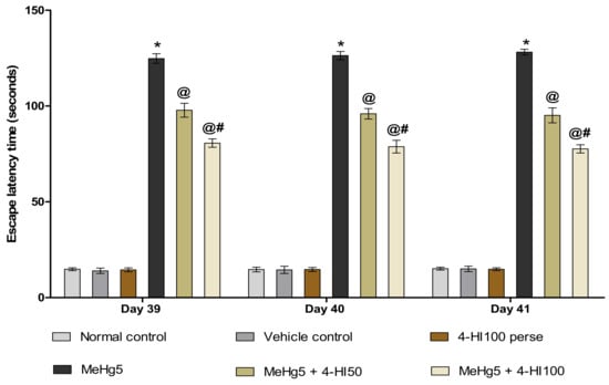 Escape latency time (ELT) was evaluated on the treatment schedule’s 39th, 40th and 41st days. MeHg-treated rats showed a gradual increase in ELT compared to the normal control, vehicle control, and 4-HI100 perse groups. Chronic treatment with 4-HI 50 mg/kg and 100 mg/kg resulted in a significant decrease in ELT compared to the MeHg-treated group (two-way ANOVA: F(10,60) = 1.891, p < 0.001). Administration of 4-HI100 mg/kg led to a marked decline in ELT compared to the 4-HI 50 mg/kg treatment, suggesting that 4-HI at a dose of 100 mg/kg is more efficient in improving memory acquisition in rats (Figure 8).