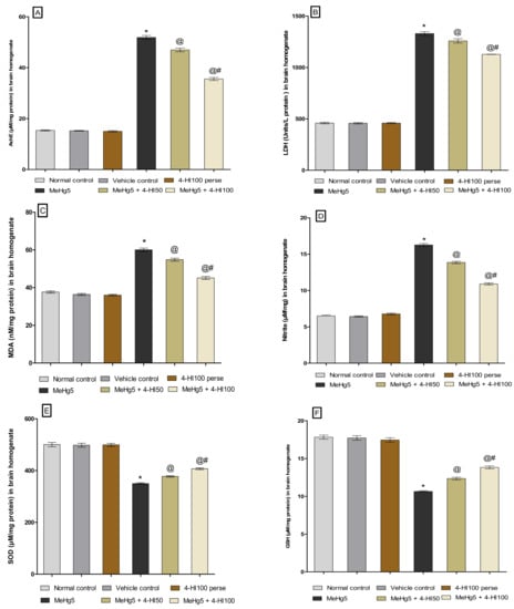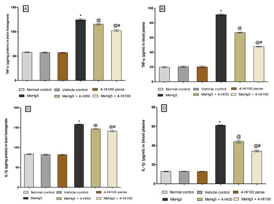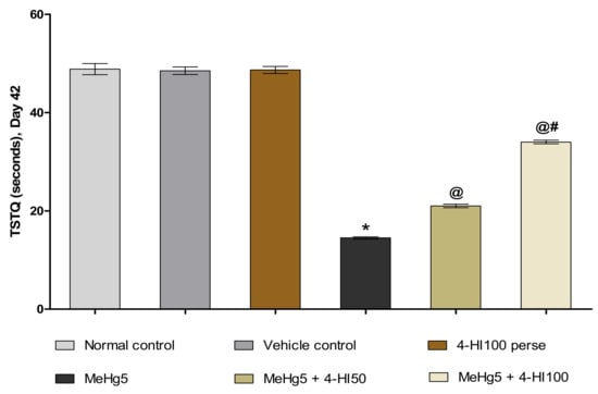 MeHg+ was purchased from Sigma-Aldrich (St. Louis, MO, USA). The test drug, 4-HI (amorphous, hydrophilic powder), was acquired as an ex-gratia sample from BAPEX Pharmaceuticals, India. All of the other compounds employed in the study were of analytical grade. An aqueous solution of 4-HI with 2% ethanol was administered in 10 mL/kg volume via oral gavage [42,45].
