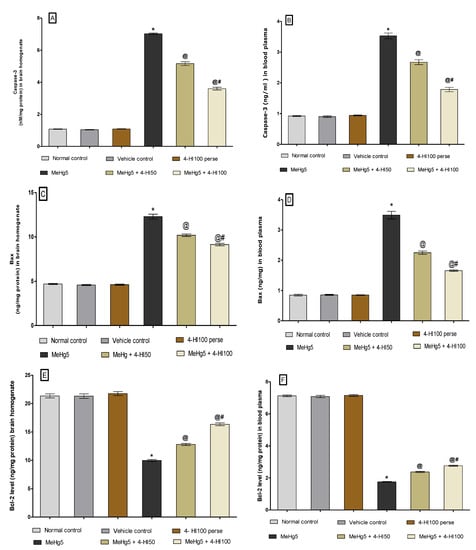 The level of pro-apoptotic markers like caspase-3, Bax, and anti-apoptotic Bcl-2 was assessed using ELISA assay kits (E-EL-R0160/Caspase-3; E-EL-R0098/Bax/Bcl2Elabsciences, Wuhan, China). As per the given standard procedures, quantification tests for caspase-3 were performed in rat brain homogenate [63] and blood plasma [64]. Similarly, Bax level was measured in brain homogenate [65] and blood plasma samples [66]. Moreover, the concentration of Bcl-2 protein was also evaluated in rat brain homogenate [67] and blood plasma [68] obtained from rats. The caspase-3 level was measured in brain homogenate as nM/mg protein and blood plasma as ng/mL [47]. The level of Bax/Bcl-2 in brain homogenate and blood plasma were represented in ng/mg and ng/mL, respectively.