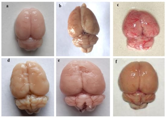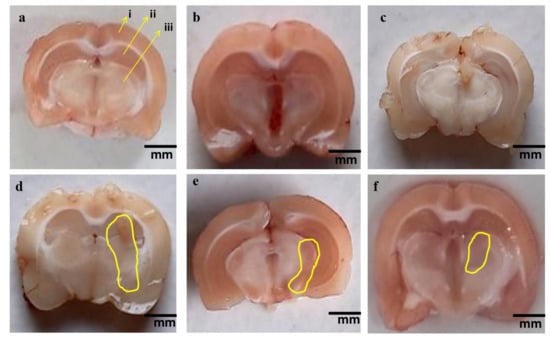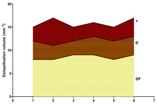Animals were decapitated and sacrificed on day 43 after completing the experimental schedule. Fresh, whole brains were isolated from the skull, freshly weighed, and immediately preserved in ice-cold saline for gross pathological analysis. Coronal brain sections were taken after a macroscopic examination of the whole rat brain [81]. Cerebral hemispheres were sectioned into 2 mm thick parallel coronal slices and placed on glass slides for morphological and pathological assessment. A digital camera was used for macroscopic inspection of the entire striatum [67]. The volume of the demyelinated region (mm3) for each brain segment was estimated from the greyish region around the striatum. The extent of white matter degeneration in each coronal segment was determined by calculating the demyelination volume (length × breadth × height) [4].