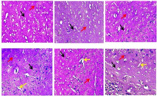 Once the experimental protocol was finished, the animals were anaesthetised with sodium phenobarbital (270 mg/mL, i.p.) and sacrificed by decapitation. The cerebral cortex was delicately removed from the whole brain for histological investigation. The isolated area was thoroughly cleaned before slicing into 0.5 cubic centimetre slices. Following a further fixation in 4% paraformaldehyde in PBS PH = 7.4 overnight (8–12h) at room temperature, immersion in 70% ethanol was performed. The tissue was kept at 37°C until it was ready to be embedded in paraffin wax. The paraffin blocks were chopped into 4–5 m thickness using a rotary microtome. Hematoxylin and eosin staining was used on the sections, and morphology was analysed using a fluorescent microscope (Type 102 M;100 × Magnification). The properties and density of the normal neuronal population (Oligodendrocytes, microglial cells, and area of necrosis) in the cerebral cortex were observed blindly using a fluorescent microscope with a reticular consolidated eyepiece at a magnification of 100× [29].