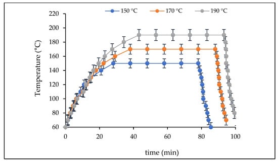 Temperature change profile during hydrothermal pretreatment (150, 170 and 190 °C, respectively, for 50 min).