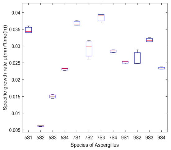 Boxplot of the specific growth rate of Aspergillus species on Sargassum spp. after hydrothermal pretreatment at 150, 170, and 190 °C without nutritional enrichment (5S1: 150 °C, Aspergillus oryzae; 5S2:150 °C, Aspergillus niger HT3; 5S3: 150 °C, Aspergillus niger Aa20; 5S4: 150 °C, Aspergillus niger Aa210; 7S1: 170 °C, Aspergillus oryzae; 7S2:170 °C, Aspergillus niger HT3; 7S3: 170 °C, Aspergillus niger Aa20; 7S4: 170 °C, Aspergillus niger Aa210; 9S1: 190 °C, Aspergillus oryzae; 9S2:190 °C, Aspergillus niger HT3; 9S3: 190 °C, Aspergillus niger Aa20; 9S4: 190 °C, Aspergillus niger Aa210).