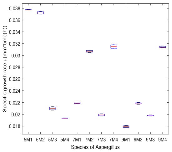 Boxplot of the specific growth rate of Aspergillus species on Sargassum spp. after hydrothermal pretreatment at 150, 170, and 190 °C with nutritional enrichment (5M1: 150 °C, Aspergillus oryzae; 5M2:150 °C, Aspergillus niger HT3; 5M3: 150 °C, Aspergillus niger Aa20; 5M4: 150 °C, Aspergillus niger Aa210; 7M1: 170 °C, Aspergillus oryzae; 7SM2:170 °C, Aspergillus niger HT3; 7M3: 170 °C, Aspergillus niger Aa20; 7M4: 170 °C, Aspergillus niger Aa210; 9M1: 190 °C, Aspergillus oryzae; 9M2:190 °C, Aspergillus niger HT3; 9M3: 190 °C, Aspergillus niger Aa20; 9M4: 190 °C, Aspergillus niger Aa210).