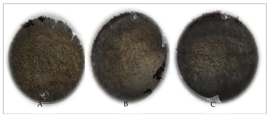 Growth of Aspergillus oryzae on Sargassum spp. after hydrothermal pretreatment at 150 (A), 170 (B) and 190 °C (C) without nutritional enrichment.