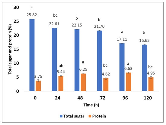 The highest protein content was found at 96 h (6.6 ± 0.2) (Figure 5) and the lowest at 72 h (4.6 ± 0.4) compared with the control (3.7 ± 0.40). The microorganisms can assimilate the concentration of carbohydrates to form fungal mycelium []. This scientific report is consistent with what was found in this study because there was an increase in protein content from 24 h (5.4 ± 0.1%) to 48 h (6.3 ± 0.0). A decrease in the concentration of total sugars was observed from 24 to 120 h (Figure 5). At the beginning of fermentation, the pH was 5.93 ± 0.02, a satisfactory pH for fungal growth according to the literature []. According to the analysis of variance (ANOVA), significant differences are observed in the percentage of proteins and total sugars during solid-state fermentation kinetics. Proteins increase due to Aspergillus oryzae. These filamentous fungi can depolymerize complex carbohydrates (cellulose, fucoidan, and alginate) []. In the same way, these fungi can ferment or grow on the biomass of the seaweed, and assimilate the complex substrates, to produce fungal biomass, rich in proteins and edible—these are called mycoproteins [].