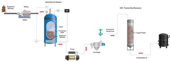 Solid-state fermentation system (packed-bed bioreactor) for Sargassum spp. pretreated at 170 °C to obtain fungal proteins from Aspergillus oryzae.