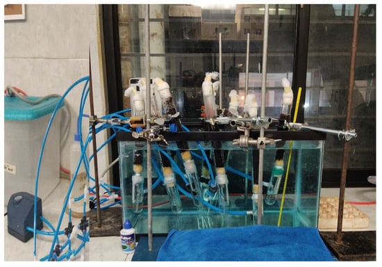 For solid-state fermentation of Sargassum spp. pretreated at 170 °C, glass columns with a diameter of 2.5 mm were used. Within each of the columns, 10 g of pretreated Sargassum spp. was added. Likewise, the system had a constant temperature of 30 °C and a humidity of 70%. In the same way, moist air was added to the columns using humidifiers connected to an air pump (Figure 9).