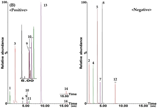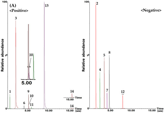 Compounds 114 were isolated and eluted from all markers within 20 min on an Acquity UPLC BEH C18 reversed-phase column (2.1 mm × 100 mm, 1.7 µm; Waters, Milford, MA, USA) maintained at 40 °C and gradient elution of a mobile phase system of distilled water–acetonitrile (both containing 0.1% acetic acid) (Table S1). UPLC–MS/MS MRM conditions for simultaneous quantification of 14 marker analytes selected for the quality evaluation of GSH were explored. For quantification of the product ion (Q3) from the precursor ion (Q1) of each marker under the optimized MRM conditions of the markers, the MRM peak data were acquired for approximately 0.5 min at the retention time of each marker, and detailed parameters are presented in Table 1. Figure 1 shows the UPLC–MS/MS MRM chromatograms obtained in the positive and negative ion modes by applying optimized analysis conditions. The blank chromatogram of each analyte is shown in Figure S2.
