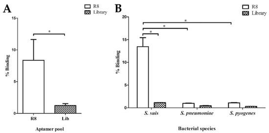 Characterization of RNA aptamer pool. (A) Enrichment of RNA aptamer pool derived from round eighth (R8) of cell-SELEX assay. The % binding of R8 RNA aptamer pool compared to the library (Lib) was presented. (B) Specificity of R8 RNA aptamer pool. The R8 RNA aptamer pool and random RNA Lib were tested with S. suis, S. pneumoniae, and S. pyogenes. * indicates the statistically significant difference using a Mann–Whitney U test (p < 0.05).