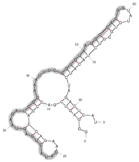 The aptamer pool from cell-SELEX round 8 was cloned using pTG19-T PCR cloning vector B (Vivantis, Selangor, Malaysia). Twenty-six clones were sequenced and analyzed for similarity using the Clustal Omega Multiple Sequence Alignment (https://www.ebi.ac.uk/Tools/msa/clustalo/ accessed on 11 November 2020). The selected RNA aptamer was also predicted for secondary structure using the mfold Web Server (http://www.unafold.org/mfold/applications/rna-folding-form.php accessed on 7 February 2021) to determine the binding sites between the aptamer and target cells.