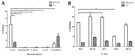Specificity of the R8-su12 RNA aptamer. (A) The specificity of R8-su12 RNA aptamer was tested using target S. suis SS 2, P1/7 and non-target cells. (B) The specificity of R8-su12 RNA aptamer was tested using target S. suis SS 2, P1/7 and other S. suis serotypes. * indicates a statistically significant difference using a Mann–Whitney U test (p < 0.05).