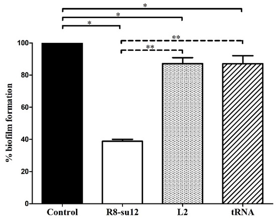 2.3. The Effect of R8-su12 RNA Aptamer on S. suis SS 2, P1/7 Biofilm Formation