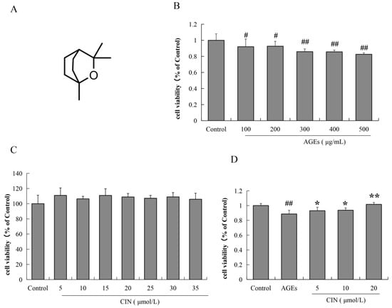 The chemical structure of CIN and the effects of AGEs and CIN on SH-SY5Y cell viability. (A) Chemical structure of CIN. (B) The MTT assay was used to detect the effect of AGEs on SH-SY5Y cell activity. (C) The MTT assay was used to detect the effect of CIN on SH-SY5Y cell activity. (D) The MTT assay was used to detect the effect of CIN on AGEs-induced SH-SY5Y cell activity. n = 6. # p < 0.05, ## p < 0.01 vs. the control group; * p < 0.05, ** p < 0.01 vs. the model group.