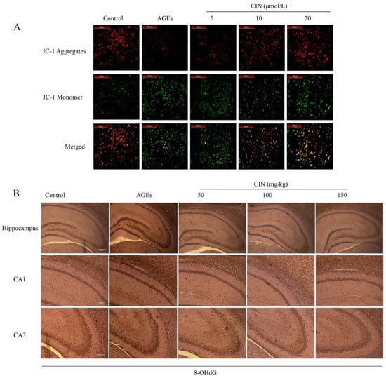 Effects of CIN on AGEs-induced oxidative damage. (A) Mitochondrial membrane potential was detected by JC-1 staining and viewed by fluorescence microscope (scale bar = 200 μm). (B) IHC staining of rat brain immunostained with antibody against 8-OHdG (scale bar, hippocampus group: 500 µm; CA1, CA3 group: 250 µm).