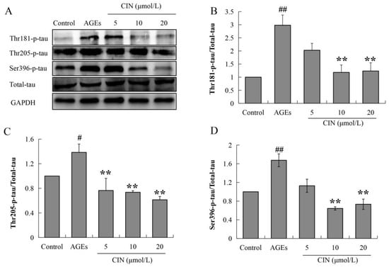 Effects of CIN on the tau hyperphosphorylation in vitro. (A–D) The protein levels of phosphorylated tau at thr181, thr205 and Ser396 sites in SH-SY5Y cells were detected by Western blot. n = 3. # p < 0.05, ## p < 0.01 compared with the control group; ** p < 0.01 compared with the model group.