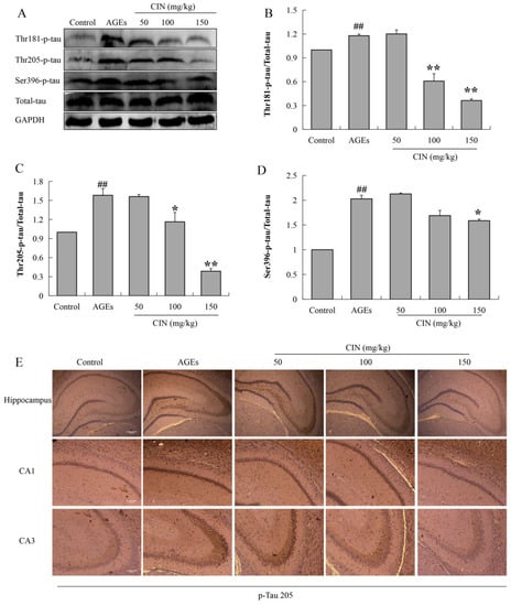 Hyperphosphorylated tau has neurotoxicity, resulting in neuronal synaptic damage and apoptosis. In order to explore the effect of CIN on AD pathology, we detected the phosphorylation level of the tau protein. The Western blot results showed that CIN could alleviate the abnormal phosphorylation levels of tau proteins at the thr205, thr181 and ser396 sites induced by AGEs both in vitro (p < 0.01; Figure 3) and in vivo (p < 0.05 or p < 0.01; Figure 4A–D). The IHC method was used to further determine the effect of CIN on the phosphorylation level of tau proteins at the thr205 site in the hippocampus. It was shown that tau was hyperphosphorylated at the thr205 site after the ICV-injected with AGEs and CIN treatment resulted in a decline of tau hyperphosphorylation (Figure 4E).