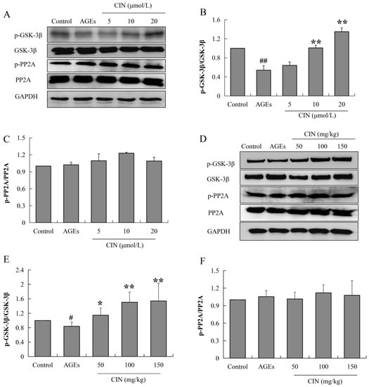 Tau phosphorylation is mainly regulated by the protein kinase and phosphatase activity. When phosphatase activity is inhibited or the protein kinase is over-activated, tau is hyperphosphorylated. Glycoase-3β (GSK-3β) is the most important protein kinase that regulates tau phosphorylation, and the enhancement of protein phosphatase 2A (PP2A) activity can inhibit abnormal tau phosphorylation. In order to investigate the mechanisms of CIN intervention in tau pathology, the activities of GSK-3β and PP2A were detected via Western blot. CIN inhibited the AGEs-induced overactivation of GSK-3β (p < 0.05 or p < 0.01), while the activity of PP2A was not affected both in vitro (Figure 5A–C) and in vivo (Figure 5D–F). This suggests that GSK-3β played a critical role in CIN preventing AGEs-induced tau phosphorylation.