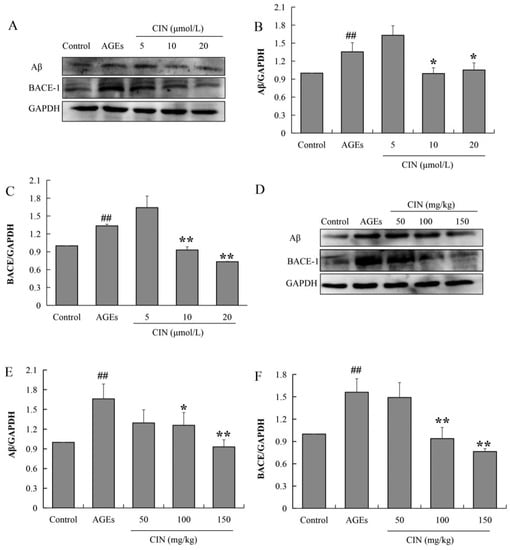 The aggregation and deposition of Aβ inhibit the function of neurons and induce synaptic dysfunction as well as memory impairment. Aβ peptides are derived from the β-amyloid precursor protein (APP), and the beta-site amyloid precursor protein cleaving enzyme-1 (BACE-1) is the rate-limiting enzyme to cleaved APP. To investigate the effect of CIN on AD pathology, we also detected the expressions of Aβ and BACE-1 via Western blot. The results show that AGE treatment increased the expression levels of Aβ and BACE-1, and CIN treatment resulted in a decline in AGEs-induced Aβ production by inhibiting BACE-1 both in vitro (p < 0.05 or p < 0.01; Figure 6A–C) and in vivo (p < 0.05 or p < 0.01; Figure 6D–F).