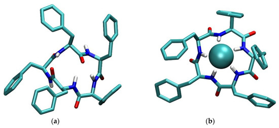 The MD simulations were produced using the GROMACS package (version 2019.5, University of Groningen; Stockholm Royal Institute of Technology; Uppsala University) [26,27,28,29,30,31,32]. Intramolecular and nonbonded intermolecular interactions were modelled by the Optimized Parameters for Liquid Simulations-All Atoms (OPLS-AA) force field [33]. Parameters for the hydrogen sulfate and dihydrogen phosphate anions were assigned by LigParGen server [34,35,36]. The cyclopeptide L and its anion complexes were solvated in cubical boxes containing about 3000 acetonitrile or 4000 methanol molecules, with periodic boundary conditions. The solvent boxes were equilibrated prior to inclusion of solute molecules with the box density after equilibration in all cases being close to the experimental one within 2%. In the simulations where anion–ligand complexes were investigated, tetramethylammonium (TMA) cation was included to neutralize the box. This counterion was kept fixed at the box periphery, whereas the initial position of the complex was at the box center. In all simulations an energy minimization procedure was performed followed by a MD simulation in NpT conditions for 50.5 ns, where the first 0.5 ns were not used in data analysis. The Verlet algorithm [37] with a time step of 1 fs was employed. The cut-off radius for nonbonded van der Waals and short-range Coulomb interactions was 16 Å. Long-range Coulomb interactions were treated by the Ewald method as implemented in the Particle Mesh Ewald (PME) procedure [38]. The simulation temperature was kept at 298 K with the Nosé–Hoover algorithm [39,40] using a time constant of 1 ps. The pressure was kept at 1 bar by Martyna–Tuckerman–Tobias–Klein [41] algorithm and the time constant of 1 ps. Average molecular structures of cyclopeptide–anion complexes were obtained by Principle Component Analysis (PCA) on coordination matrix whose rows contained distances and angles between heavy atoms of anions, or carbonyl oxygen atoms, in the case of free L, and amide nitrogen and hydrogen atoms of peptide ligands. The chosen structures were closest to the centroids of the most populous clusters in space defined by the first two or three principal components. Figures of molecular structures were created using VMD 1.9.3 software (University of Illinois, Champaign, IL, USA) [42].