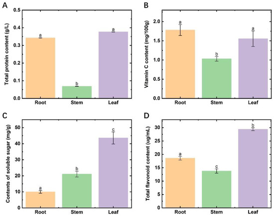 Nutrient contents in different parts of Houttuynia cordata. (A) the content of total protein; (B) the content of vitamin C; (C) the content of soluble sugar; (D) the content of total flavonoids. Different lowercase letters indicate a significant difference (p < 0.05).