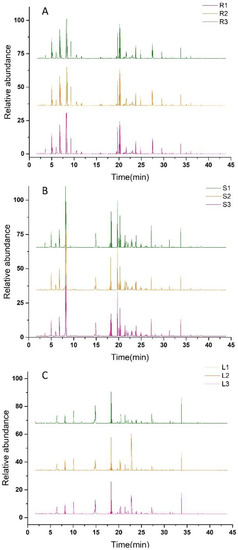 GC–MS chromatogram of Houttuynia cordata. (A) represents the total ion flow diagram of the Houttuynia cordata root; (B) represents the total ion flow diagram of the Houttuynia cordata stem; (C) represents the total ion flow diagram of the Houttuynia cordata leaf.