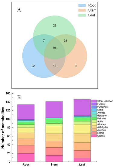 In Figure 3A, a total of 91 identical metabolites were found in different parts of Houttuynia cordata, with 22 metabolites unique to the roots and leaves and only 2 metabolites unique to the stems. In Figure 3B, 135 volatiles were detected in the roots, among which 20 olefins, 19 esters, 15 alcohols, 14 aldehydes, 12 alkanes, 7 acids, 6 ketones, 3 benzenes, 1 amide, 1 nitrile, 1 pyrazine and 35 others were accounted for. Olefins accounted for the largest proportion of volatiles in the roots, followed by ketones and lipids; 146 volatiles were detected in the stems, including 19 esters, 18 alkanes, 17 aldehydes, 15 olefins, 15 alcohols, 10 ketones, 6 acids, 3 benzenes and 38 other species. The highest relative contents were olefins, aldehydes, alkanes, and esters; 158 volatile substances were detected in the leaves of Houttuynia cordata, including 22 alkanes, 21 aldehydes, 18 lipids, 18 alcohols, 9 olefins, 8 ketones, 7 acids, 3 benzenes, 1 nitrile, 1 furan and a total of 38 others. The relative contents of aldehydes, alcohols, and olefins were the highest in total leaf volatiles.