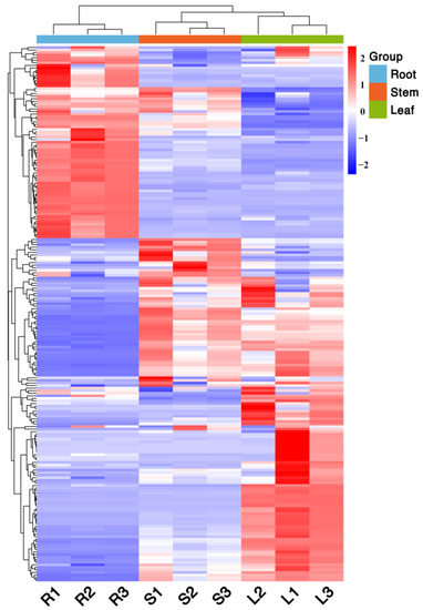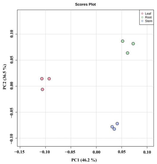 Principal component analysis (PCA) presents the characteristics of metabolomic multidimensional data through several principal components so that the variability of different groups can be observed through PCA plots. PCA was performed on the metabolites of different parts of Houttuynia cordata (PC1: 46.2%, PC2: 36.5%). As can be seen in Figure 4, the metabolites of different parts were separated on the first and second principal components, and there was significant variability in the metabolites of different parts. In the figure, each sample of each group is clustered into groups, indicating high data reproducibility and stability. The grouping of different parts was obvious, with roots dominating both the first and second principal components, leaves mainly distributed on the negative half-axis of the first principal component, and stems mainly on the negative half-axis of the second principal component.