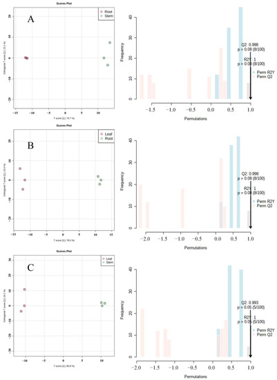 Orthogonal partial least squares regression analysis (OPLS-DA) score chart and 100 response ranking tests. (A) Root vs. stem; (B) root vs. leaf; (C) leaf vs. stem.