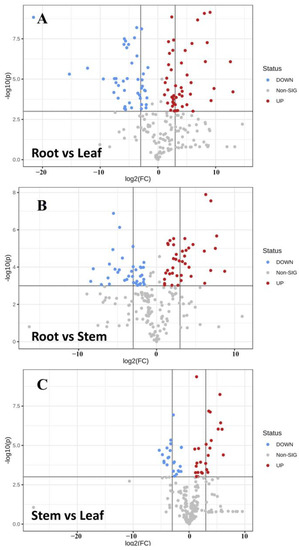 The T-test was combined with VIP values of OPLS-DA (p < 0.05 and VIP > 1) to screen the differential metabolites of different parts. Meanwhile, volcanic maps of different metabolites were drawn according to VIP and fold variation values (Figure 7). The statistics of significant differences in metabolites of different parts of Houttuynia cordata are shown in Table 1. There were more differential metabolites in the roots compared to the stems and leaves and more up-regulated metabolites in the roots. There were not many differential metabolites between stems and leaves, and they were more significantly up-regulated in leaves.