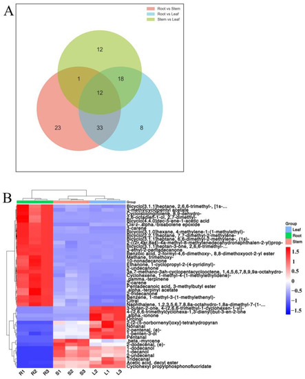 Specific differential metabolites in different parts of Houttuynia cordata. (A) heat map of differential metabolites. The color sequence from red to blue indicates metabolites abundance from high to low; (B) Wayne diagram.
