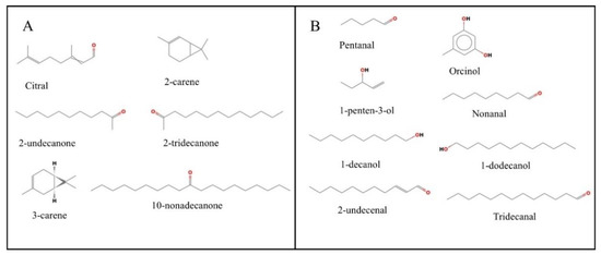 From multivariate statistical analysis and cluster analysis, the above-ground parts (stems and leaves) differ greatly from the underground parts (roots). Therefore, this study focused on analyzing the differential metabolites between above-ground and underground parts. In Figure 9, the screening looked for 14 metabolites with pharmacological effects, six of which were up-regulated in the underground part, including 10-nonadecanone, 2-undecanone, 3-carene, 2-carene, 2-tridecanone and Citral. In the above-ground part, eight metabolites were up-regulated, including Nonanal, 1-decanol, 1-dodecanol, Tridecanal, 2-undecenal, Pentanal, 1-penten-3-ol and Orcinol.