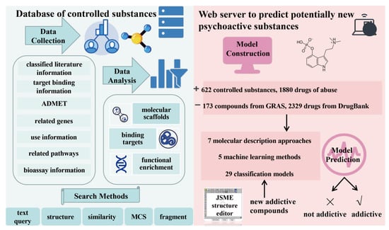 Most controlled compounds are agonists of receptors of the human central nervous system, such as opioid receptors, cannabis receptors, 5-hydroxytryptamine receptors, acetylcholine receptors, dopamine receptors, and γ-aminobutyric acid receptors [6]. The specific addiction mechanism may be related to the reward circuit mechanism in the brain [7]. For example, morphine stimulates μ receptors located on γ-aminobutyric acid neurons in the ventral tegmental area (VTA), thus disinhibiting dopaminergic neurons. This effect consequently promotes dopamine release from the VTA to the nucleus accumbens, triggering a rewarding effect [8,9]. However, the specific mechanism of addiction to most controlled substances remains unclear [10], and different levels of information must be integrated for in-depth research into controlled substances. However, a large amount of experimental data on controlled compounds exists in the scientific literature and databases. For example, the DrugBank database [11] contains information on the physiological targets and pharmacological effects of some controlled compounds; admetSAR [12] contains experimental and predicted values of the absorption, distribution, metabolism, excretion, and toxicity (ADMET) of controlled compounds; BindingDB [13] provides comprehensive information about protein–target interactions related to controlled compounds; and the Comparative Toxicogenomics Database (CTD) [14] provides detailed information on the interaction of controlled substances with genes and molecular pathways. To date, no single database provides experimental biologists with comprehensive information on controlled substances.