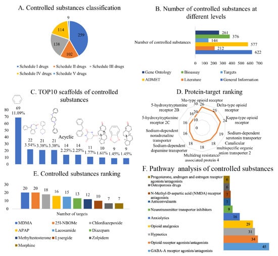 Statistical analysis of entries in AddictedChem. (A) Classification of controlled substances. (B) Number of controlled substances on different schedules. (C) Top 10 scaffolds of controlled substances, namely, benzene (11.09%), 1,3-dihydro-5-phenyl-1,4-benzodiazepin-2-one (3.54%), 4-phenylpiperidine (3.38%), 4-anilino-N-phenethyl-piperidine (3.38%), and acyclic (2.25%), diphenylmethane (2.25%), barbituric acid (1.71%), unnamed compound (1.61%), 1,3-benzodioxole (1.45%), unnamed compound (1.45%). The numbers indicate the frequency of occurrence of the scaffolds, and the percentage values are the ratio of every scaffold to 622 scaffolds. (D) Binding protein target ranking according to the number of controlled substances in the BindingDB database. (E) Controlled substances ranking according to the number of binding protein targets in the BindingDB database. (F) Pathway analysis of controlled substances. These pathways are from KEGG drug development class, and the numbers indicate the number of controlled substances.