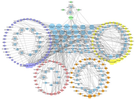 - Shannon, P.; Markiel, A.; Ozier, O.; Baliga, N.S.; Wang, J.T.; Ramage, D.; Amin, N.; Schwikowski, B.; Ideker, T. Cytoscape: A software environment for integrated models of biomolecular interaction networks. Genome Res. 2003, 13, 2498–2504. [Google Scholar] [CrossRef]