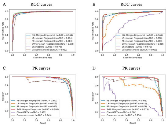 Meanwhile, the performance of the deep learning model was not better than traditional machine learning. The deep learning model performed well with the test set, but its performance with the external validation set was average. Among traditional machine learning models, the RF model performed the best, which was followed by SVM, LR, and NB. The best performance with the test set was obtained with the RF model based on MACCS (BA of 0.940 and AUC of 0.986) (Table 1). The best performance with the external validation set was obtained with the NF model based on SECFP (BA of 0.919 and AUC of 0.968). However, as shown in Table 1, some models including NB::Mol2vec, LR::RDkit, RF::MHFP6, and ChemBERT have extremely poor performance. We deduced that model overfitting might have caused some models to perform much worse on the external validation set than on the test set. The test set and the training set belong to the same source, although the compounds are different. Compared with the test set, the external validation set is a completely different source. Furthermore, the number of externally labelled validation sets is very small. These reasons may cause some overfitted models to perform poorly on external validation sets. Hence, we selected RF::MACCS and NB::SECFP from the 29 models to form a consensus model. For intuitive comparison, we further compared the receiver-operating characteristic (ROC) and PR curves of all these methods; in the machine learning algorithm, we used Morgan fingerprint because it was very stable in all models (Figure 4). The analysis revealed the necessity of constructing a consensus model that retained the best model performance and feature description to the greatest extent.