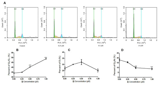 After the cells were treated with compound 2j, they were trypsinized, prepared as a single-cell suspension (1 × 106/mL), and transferred to microcentrifuge tubes for centrifugation at 1500 rpm for 5 min at room temperature; to prevent cell clumping, the cells were fixed by adding ice-cold 70% ethanol (1 mL) and blocking for 15 min at 4 °C. Then, the cells were centrifuged at 1500 rpm for 5 min, and 500 μL of PI solution was added (50 μg/mL PI, 100 μg/mL RNase A, 0.05% Triton X-100) for 40 min of incubation at 37 °C. The cells were centrifuged at 1500 rpm for 5 min, and 1 mL of PBS (HyClone, Logan, UT, USA) was added. After another centrifugation at 1500 rpm for 5 min, the cells were resuspended in 500 μL PBS and analyzed by flow cytometry.