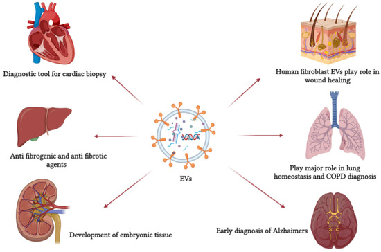 In a study conducted by Saenz-Pipaon et al. [10] aiming to evaluate the potential use of EVs as a diagnostic tool for Peripheral Arterial Diseases PAD associated with cardiovascular conditions, the study concluded that EVs are likely reliable liquid biopsy to predict the PAD molecular component signature. Additionally, EVs play a significant role in the lungs by controlling the airways’ homeostasis and providing a significant circulating disease biomarker in chronic obstructive pulmonary disease and potential therapeutic due to its cellular communication abilities [38].