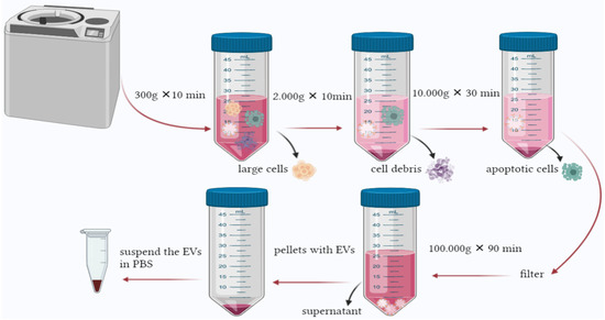 This method is declared to be the golden protocol to isolate EVs. However, its time consuming and depends mainly on the instruments needed. A fast and practical approach is required to facilitate EVs’ isolation [142]. Several studies used similar centrifugation speeds ranging between 1500× g and 125,000× g [144]. In general, the method isolates EVs based on their density. The speed gradually increases to sediment the large cells, cell debris, and apoptotic bodies. The process incorporates several steps starting with a speed as low as 300× g for a short period to pellet the cells, then 2000–10,000× g to remove apoptotic bodies and vesicles larger than EVs. The obtained supernatant will be ultracentrifuge at 100,000–200,000× g in order to pellet EVs. The obtained particles should be subjected to microfiltration to remove impurities [145] (Figure 3). Protein profiling of EVs isolated from urine by two methods was performed by Bijnsdorp et al., [146] where ultracentrifugation and heat chock proteins Vn 96-peptides were performed separately. The proteomic profiling was undertaken by mass-spectrometry analysis. The results indicated that protein profiling of EVs from both methods was similar; also, the Vn96-peptide methods are less time-consuming and can yield higher EVs.