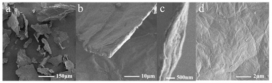Figure 1a shows the morphology of the GO precursor material, which had a sheet structure (Figure 1b,c) and a wrinkled surface (Figure 1d), consistent with prior reports [19].