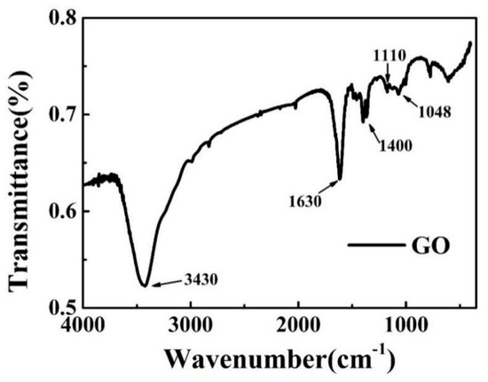 GO is a multifunctional material that contains numerous functional groups, such as epoxy (–O), hydroxyl (–OH), carboxyl (–COOH), and ether moieties. The FTIR spectrum of GO (Figure 2) contains peaks characteristic of O–H stretching vibrations (3430 cm−1), C–OH bending vibrations (1630 cm−1), saturated C–H bending vibrations (1400 cm−1), and asymmetric C–O–C stretching vibrations (1110 cm−1), showing it is rich in oxygen-containing functional groups.