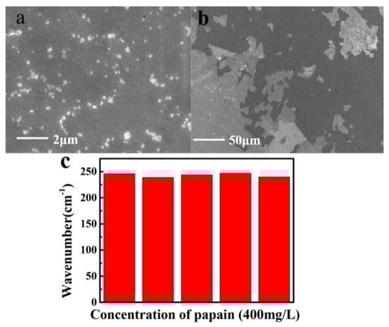 SEM images of the optimally modified GO−modified sensor (Figure 4a,b) show that the surface of the gold flake was successfully modified with GO. To determine whether the modification was reproducible, the preparation of the GO−modified sensor was repeated under the optimal conditions and used to detect a fixed concentration of papain. Figure 4c shows that there was no marked change in Fourier-transform SPR (FT-SPR) frequency, which indicated that the surface content of GO was reproducible from one preparation to the next.