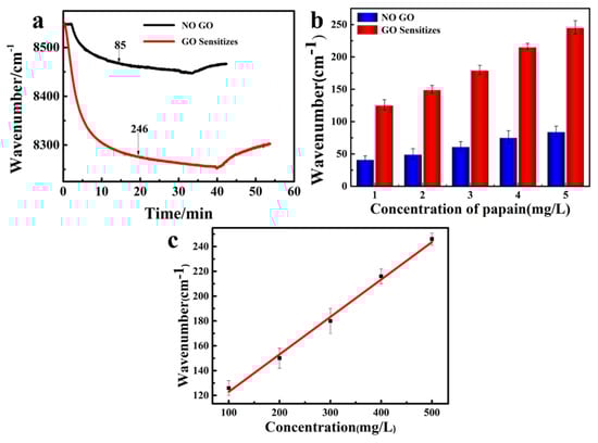 In the early work, as a mercapto protease enzyme, the papain has been reported to investigate the sensitization effect of different size noble metal nanoclusters [20]. Hence, GO-modified sensors under optimal conditions were used to detect different papain concentrations. Figure 5a compares the FT−SPR signal in response to 500 mg/L papain, using sensors with and without GO modification. The FT−SPR frequency change in response to 100–500 mg/L papain was also measured using sensors with and without GO modification. The SPR sensitivity was enhanced approximately 2.9-fold by the GO-modified sensor (Figure 5b), and a strong linear relationship (R2 = 0.994) between papain concentration and the FT−SPR frequency change was obtained (Figure 5c). The sensitizing effect of GO on SPR is that GO is modified to gold flake, which provides more binding sites and improves the sensitivity of SPR to substance detection. Considering that the surface of the bare gold of the chip has more binding sites than the GO−modified chip, we hypothesize that it is mainly due to the surface charge or the sensitizing effect of GO.