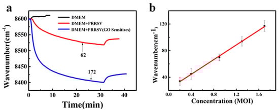 Specificity of porcine reproductive and respiratory syndrome virus (PRRSV) detection. (a) Time dependence of FT−SPR signal in response to PRRSV (2.6 MOI). (b) The linear relationship between the PRRSV concentration and the FT-SPR frequency change of the GO−modified sensor (R2 = 0.998). DMEM—Dulbecco’s modified Eagle medium; MOI—multiplicity of infection.