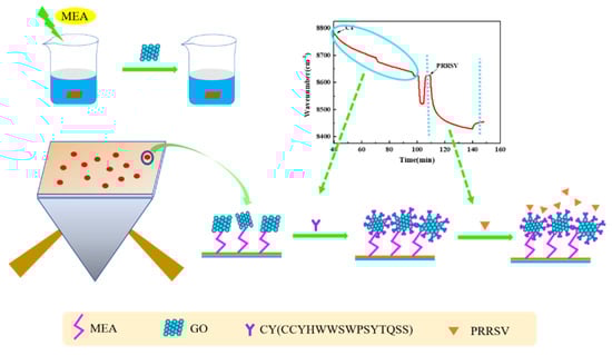The GO-modified sensor was mounted in the SPR instrument, and solutions containing the carbodiimide/N-hydroxysuccinimide activator, CY polypeptide (Sequence: NH2−CCYHWWSWPSYTQSS−COOH, Wuhan Xinghao Pharmaceutical Co., Ltd., abbreviated as CY), ethanolamine quencher, and PRRSV (in medium containing 10% serum and 1% double antibiotics) were added in turn. As a control experiment, the procedure was repeated using a PRRSV-free medium.